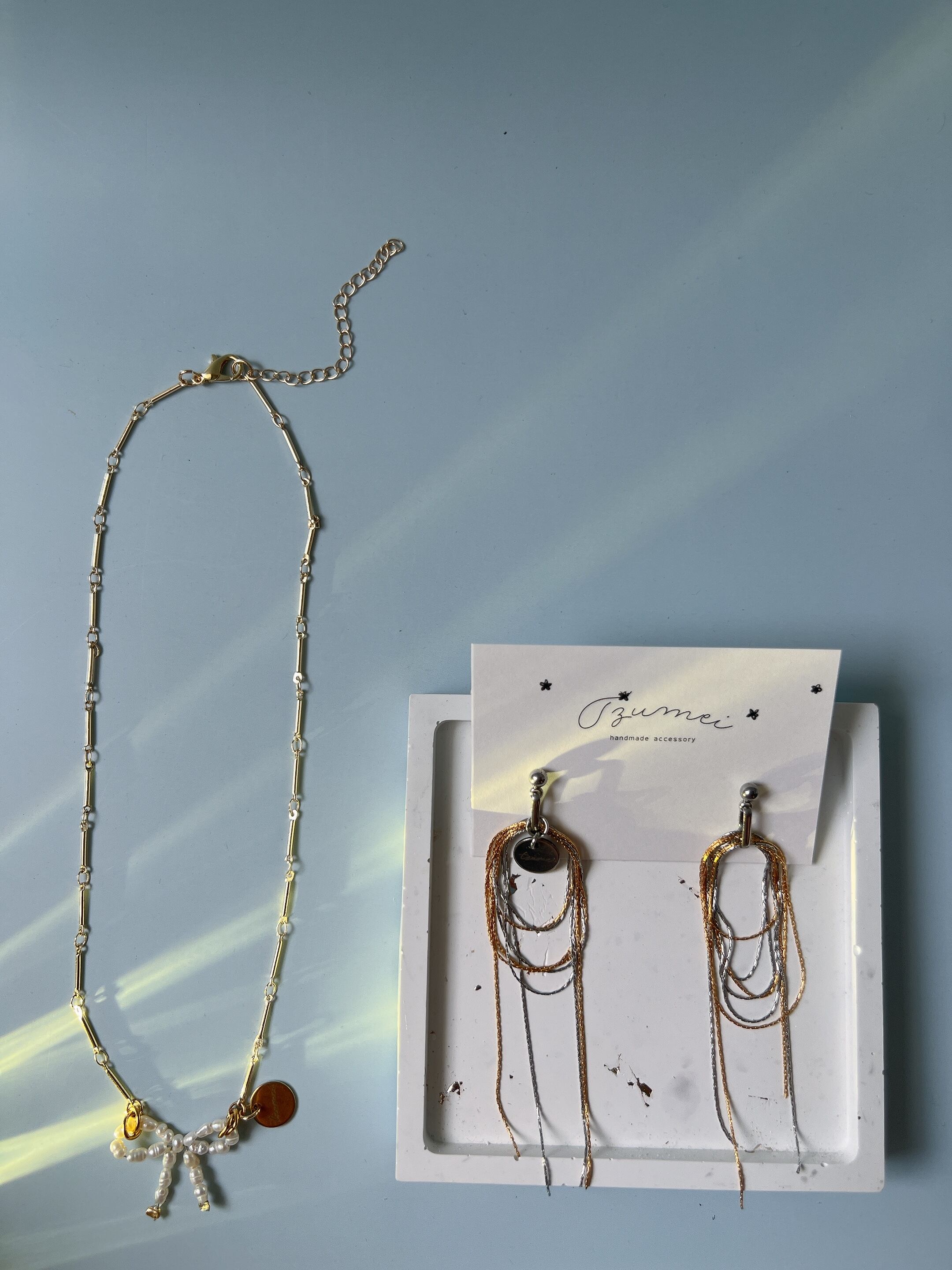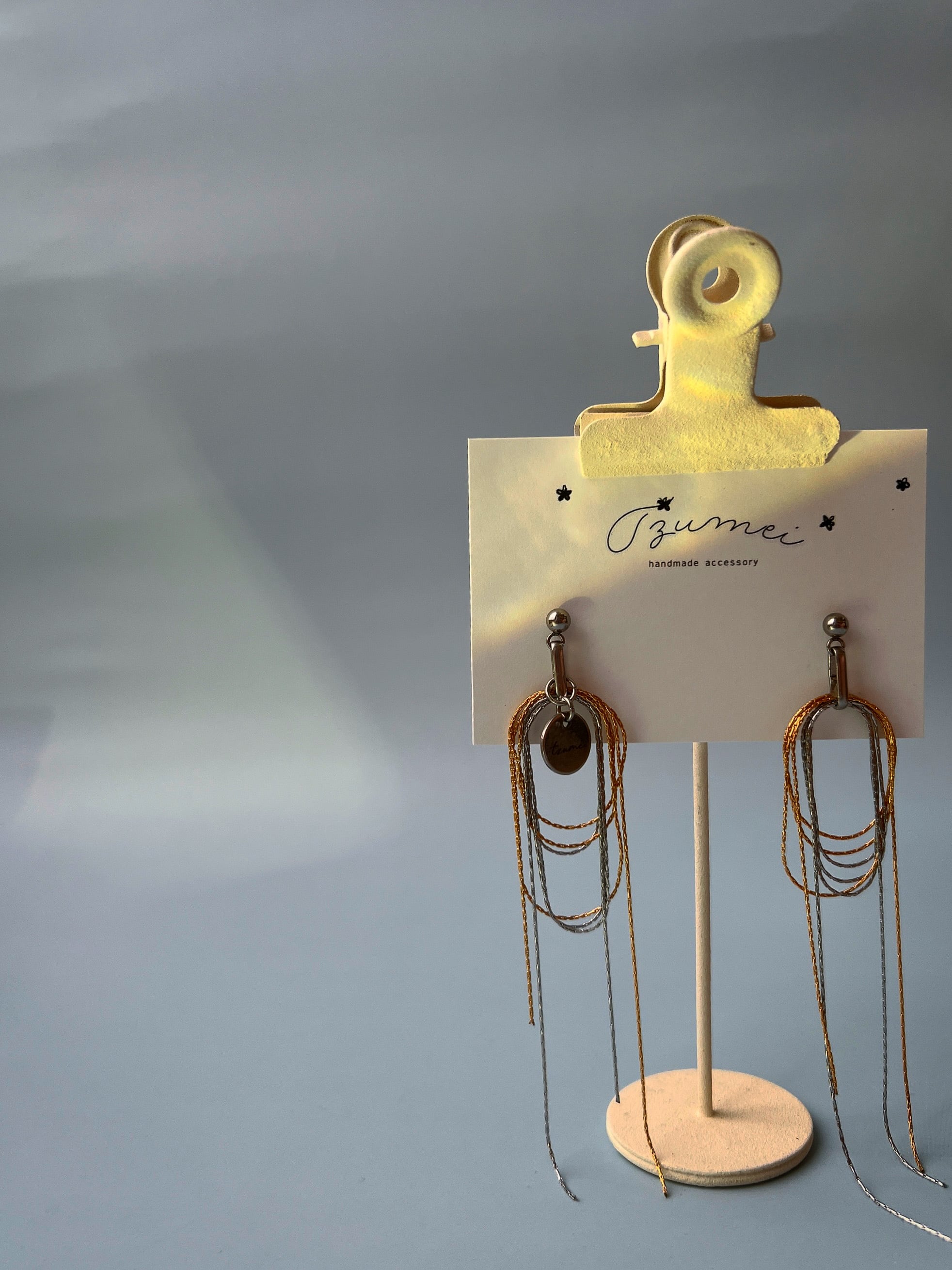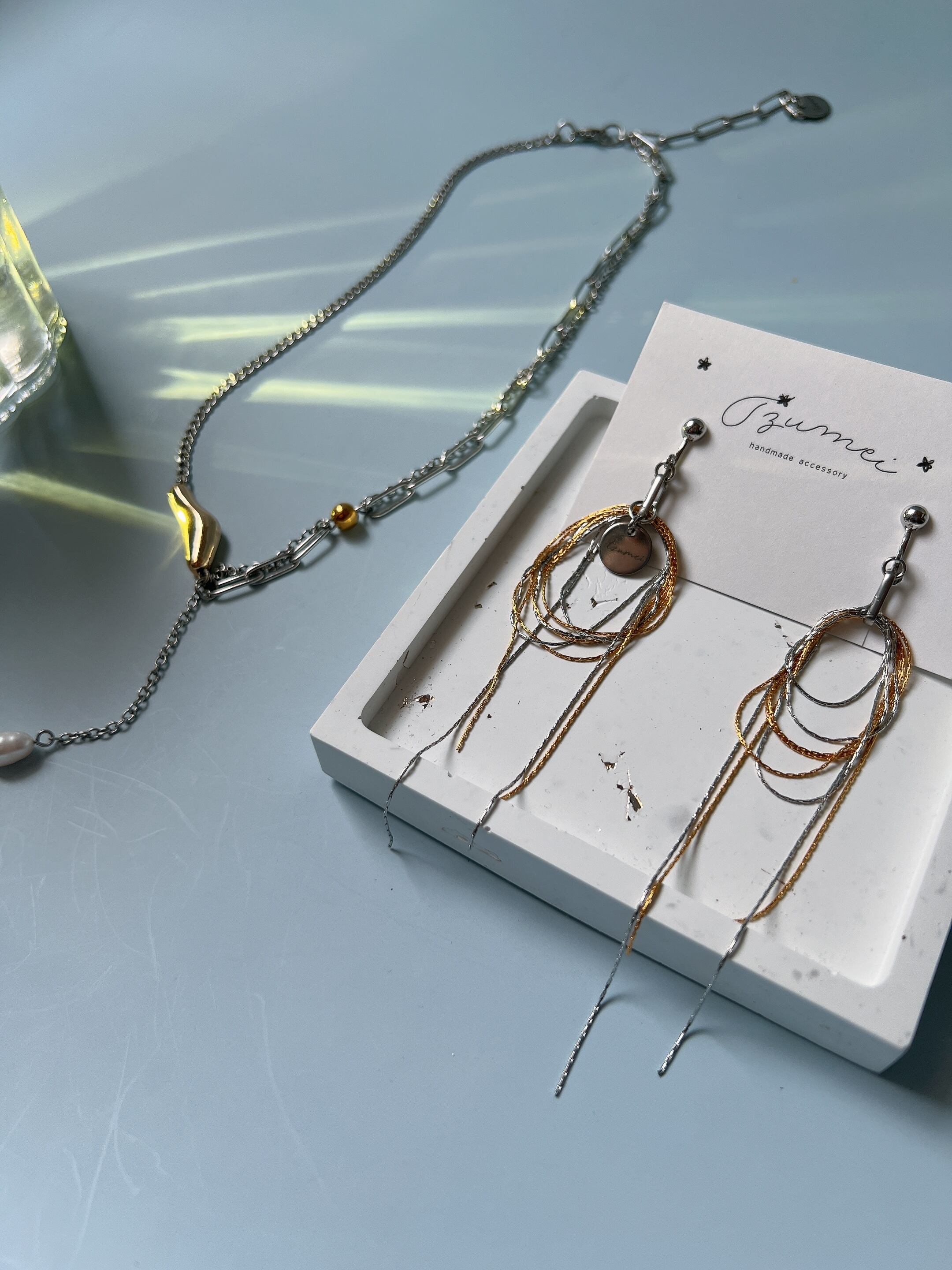 ゴールドとシルバーのとても繊細なミックスチェーンが動くたびに美しくきらめいています。