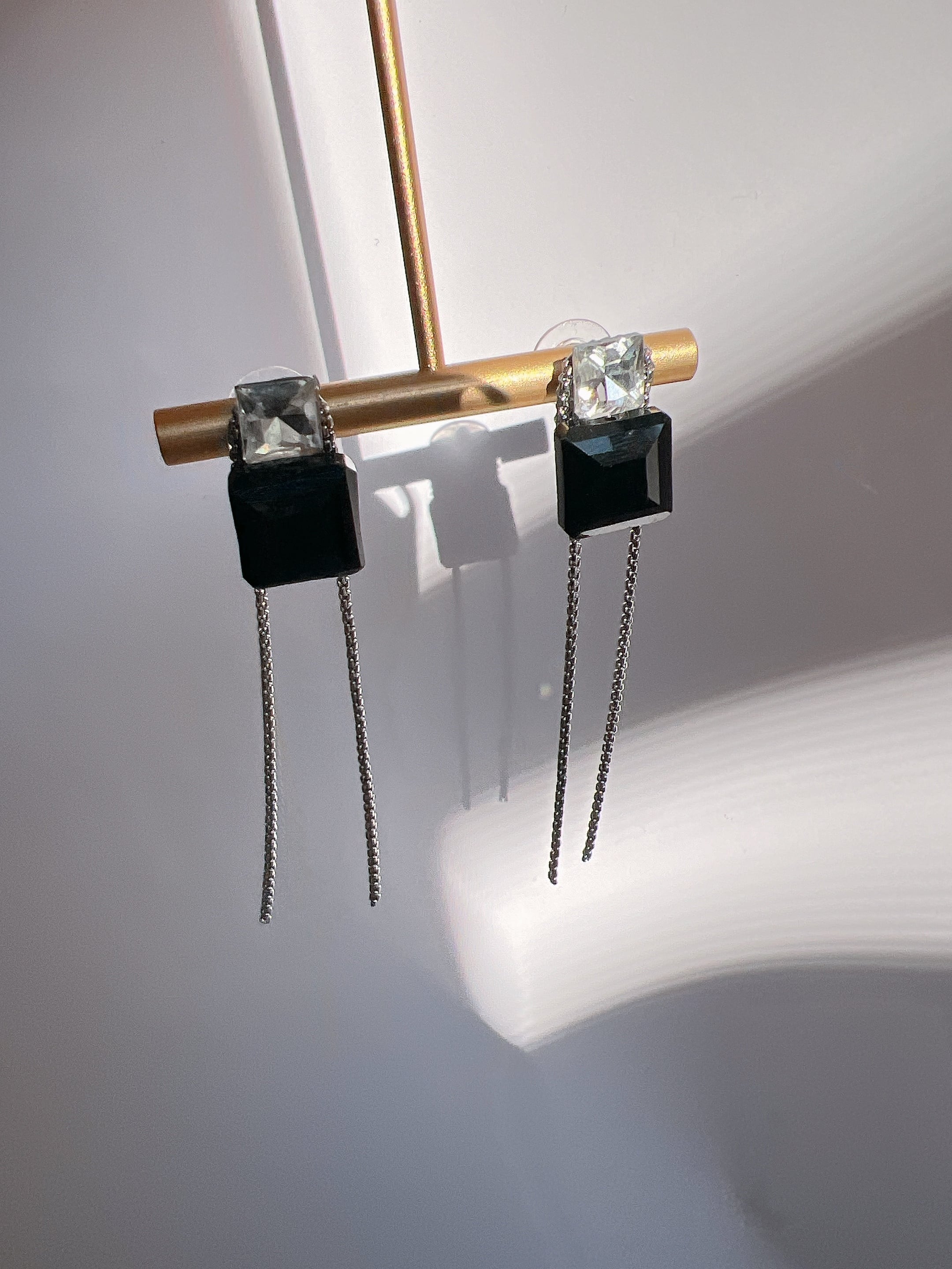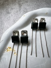 黒い四角のガラスパーツと小さめの透明感のあるクリアパーツにチェーンで繋げ、