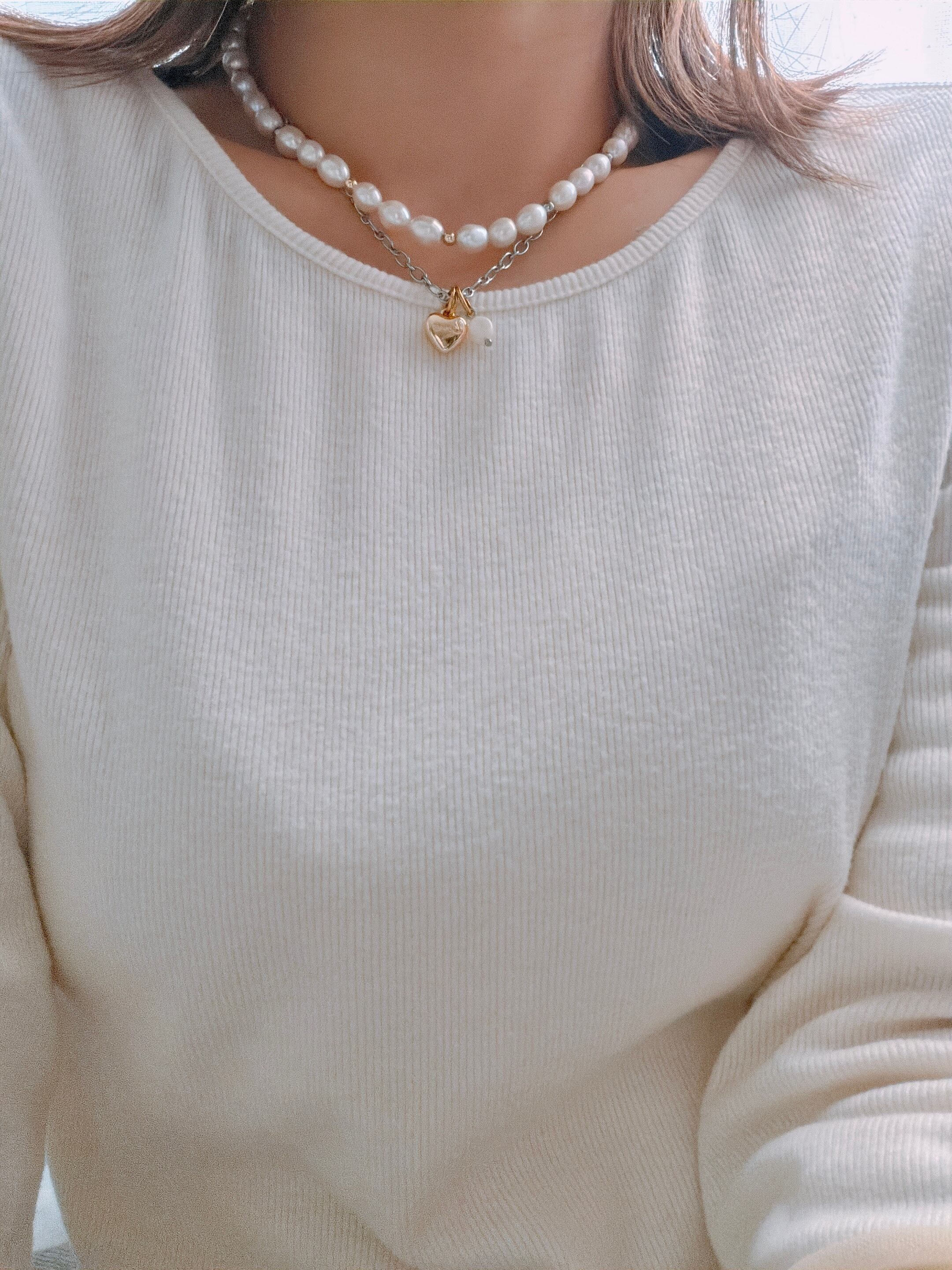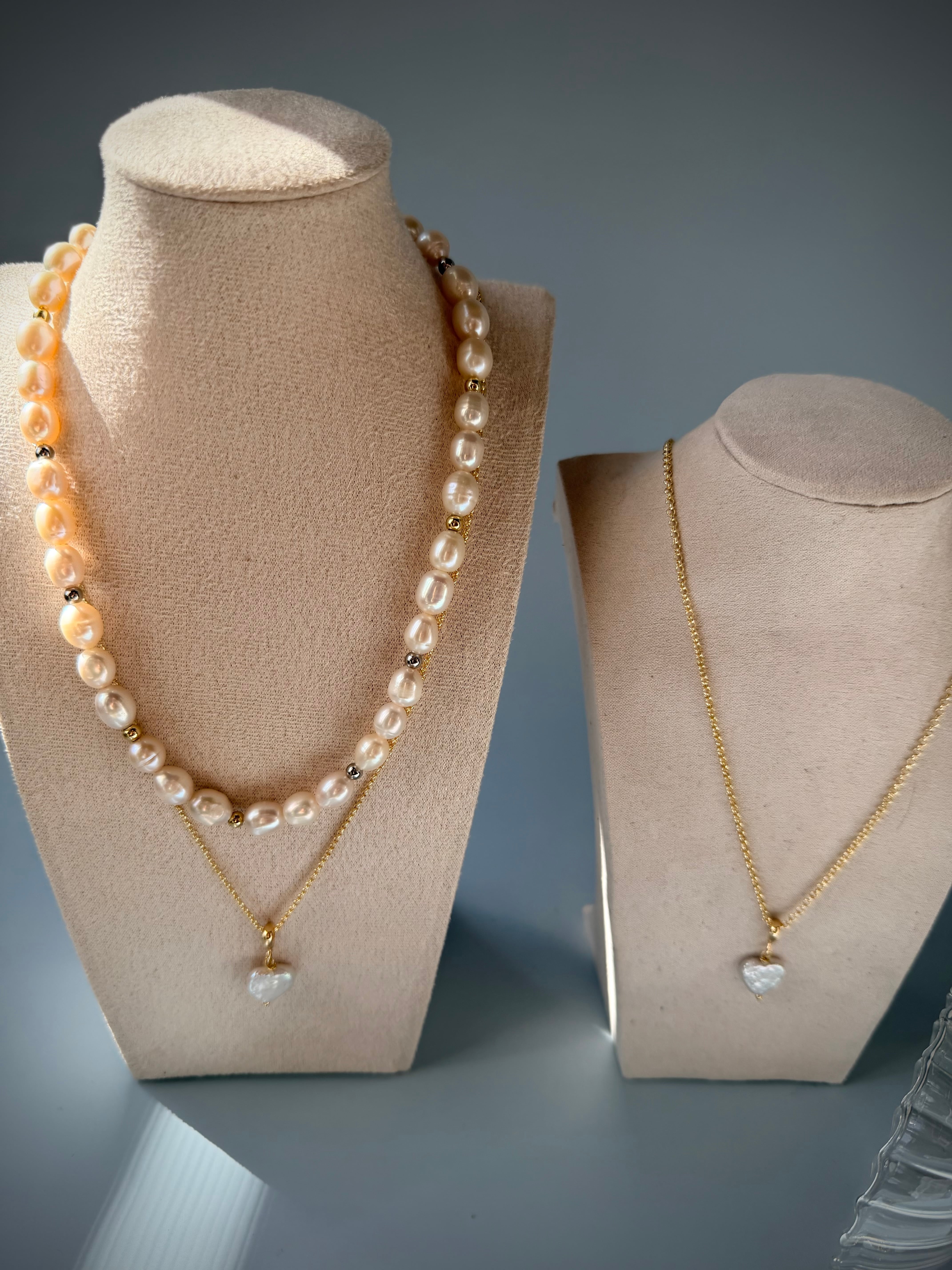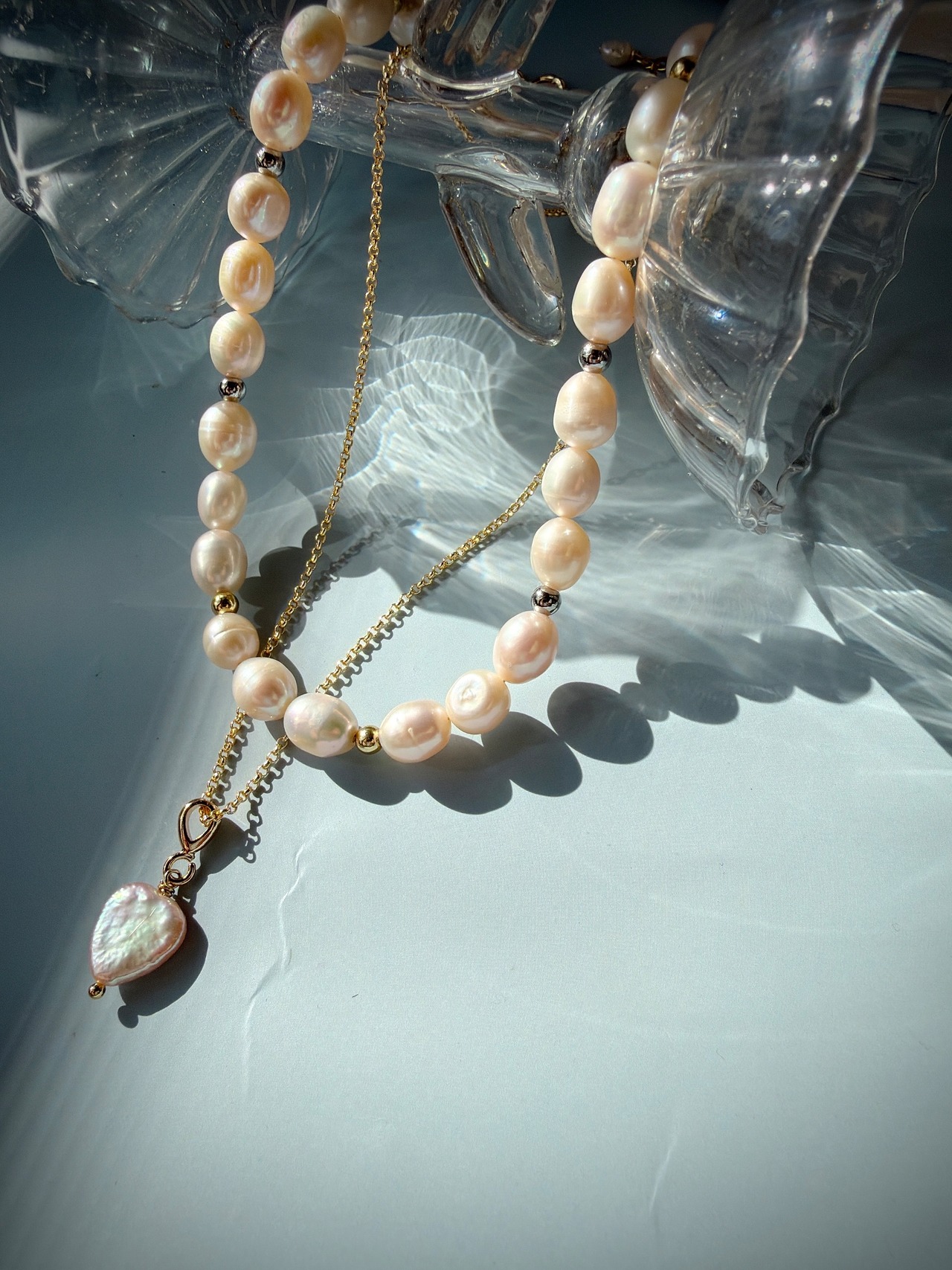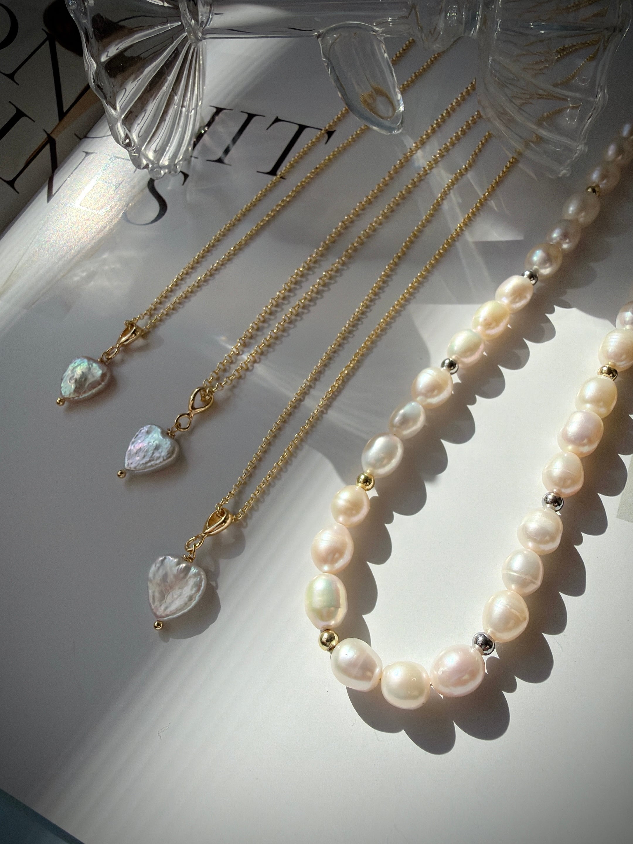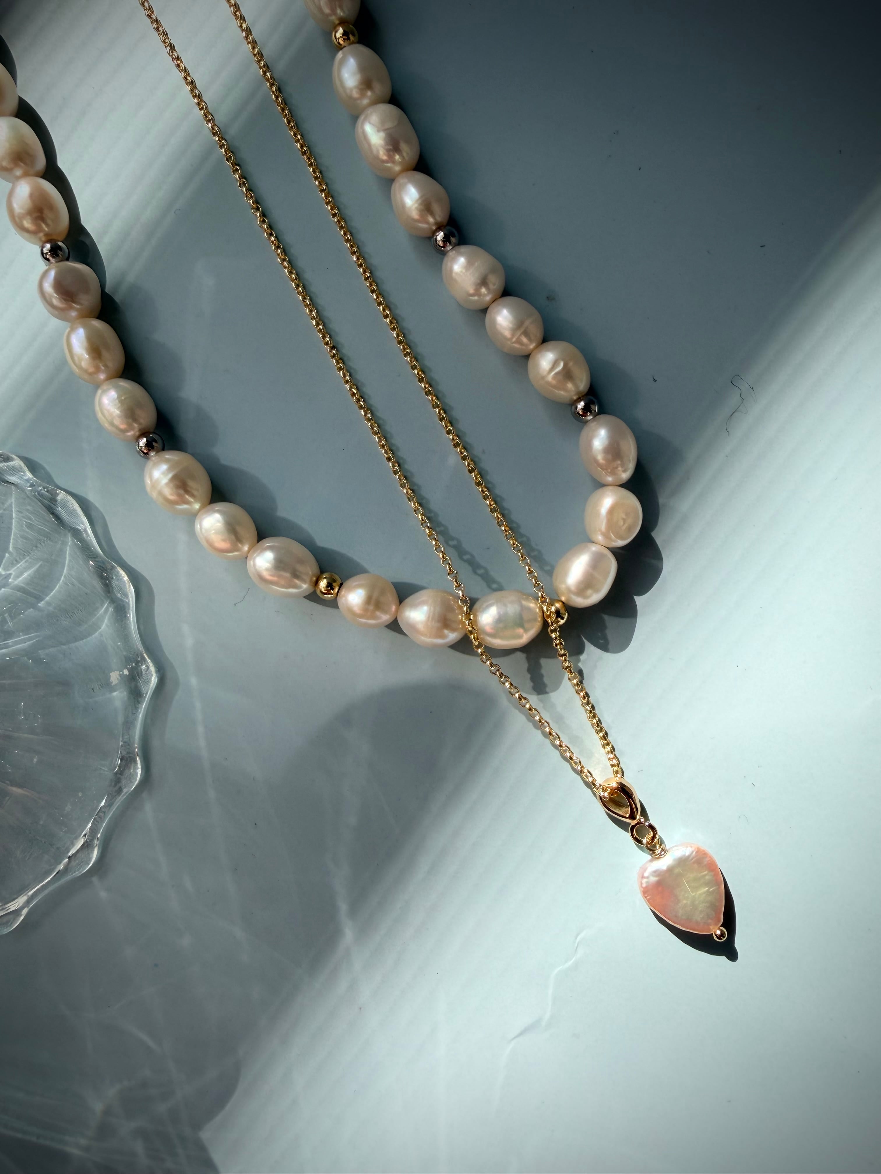 パールの間に小さいゴールドとシルバービーズを入れたことで、