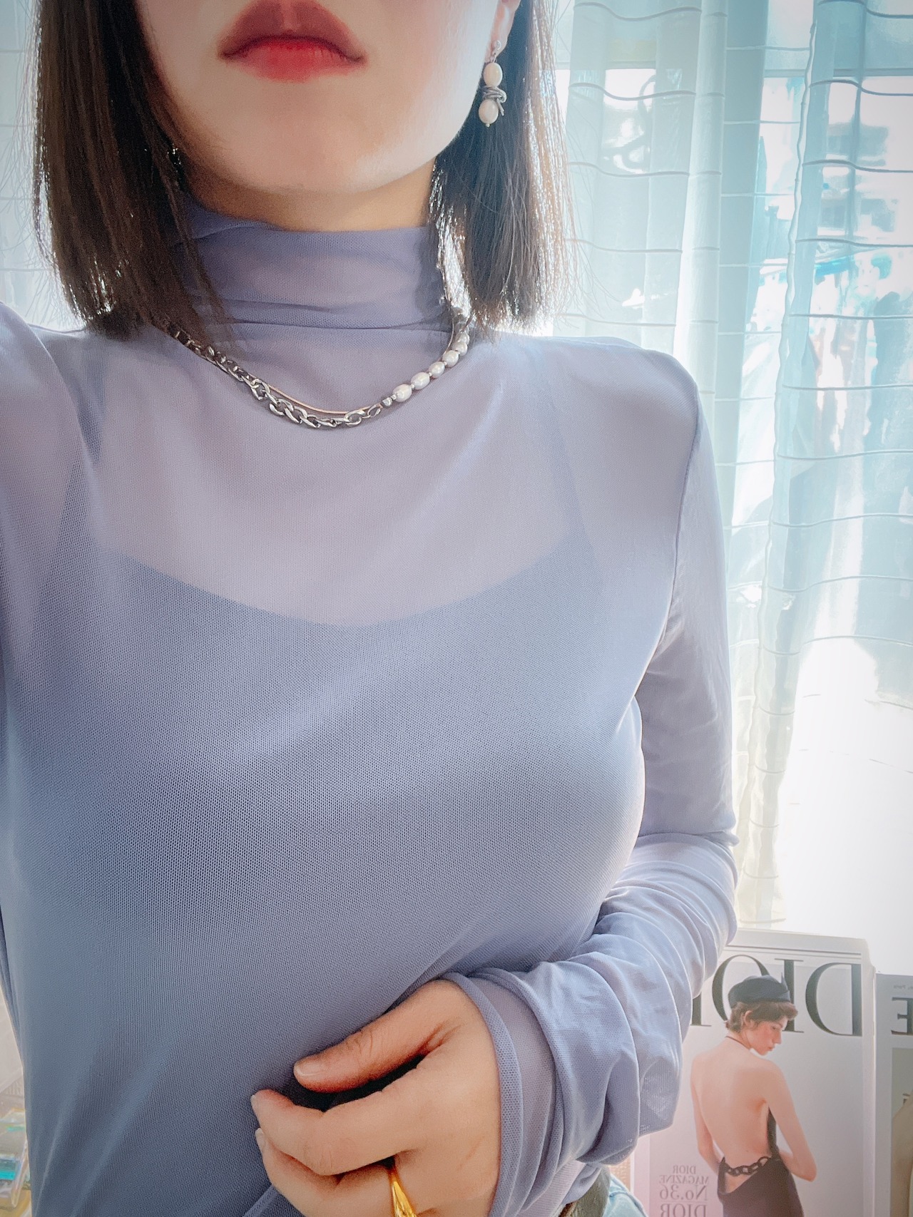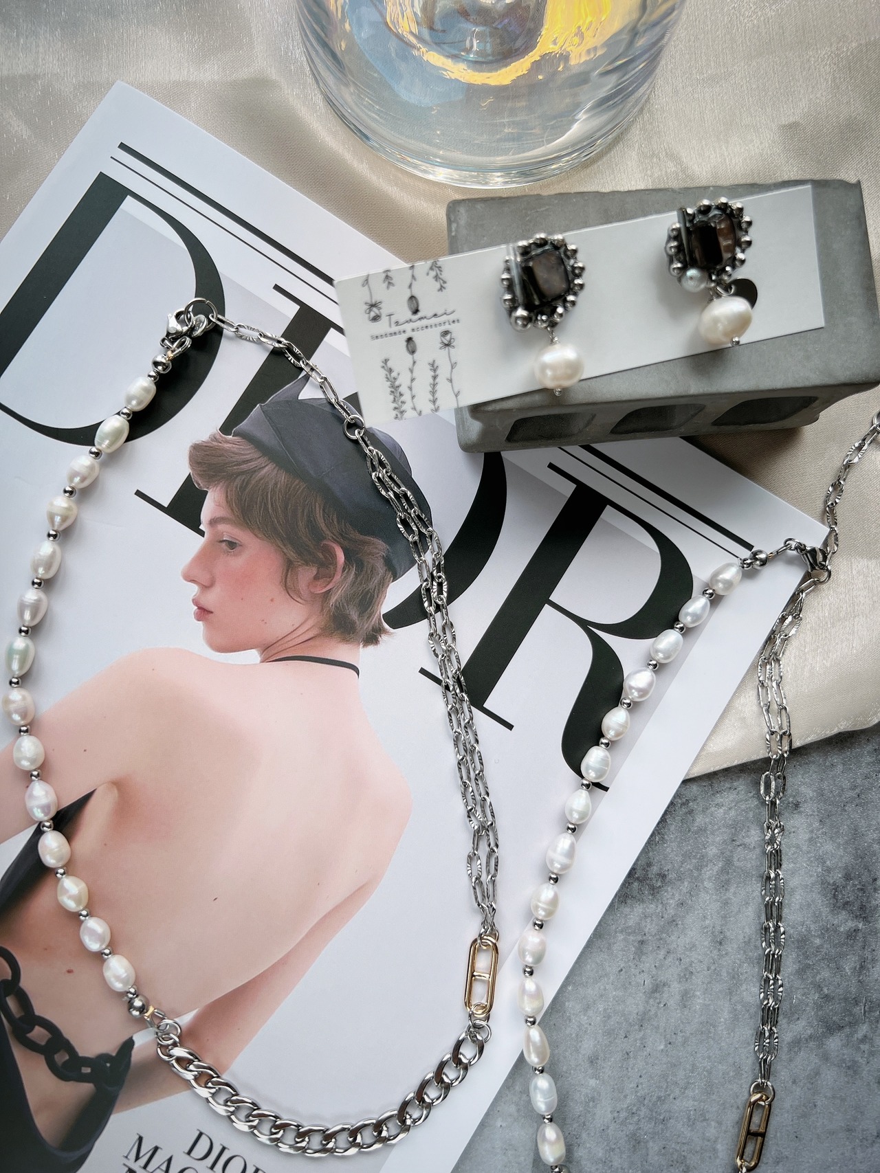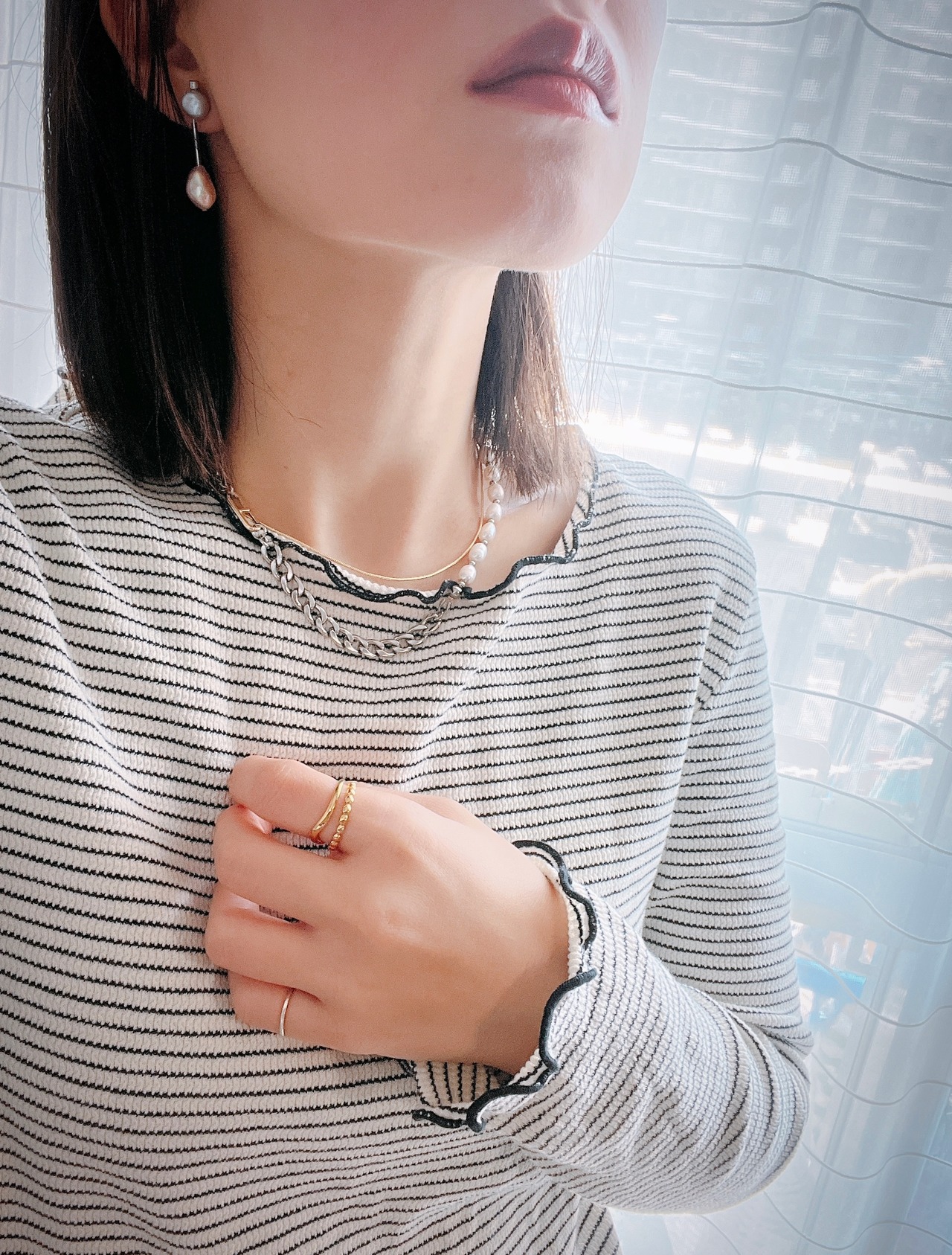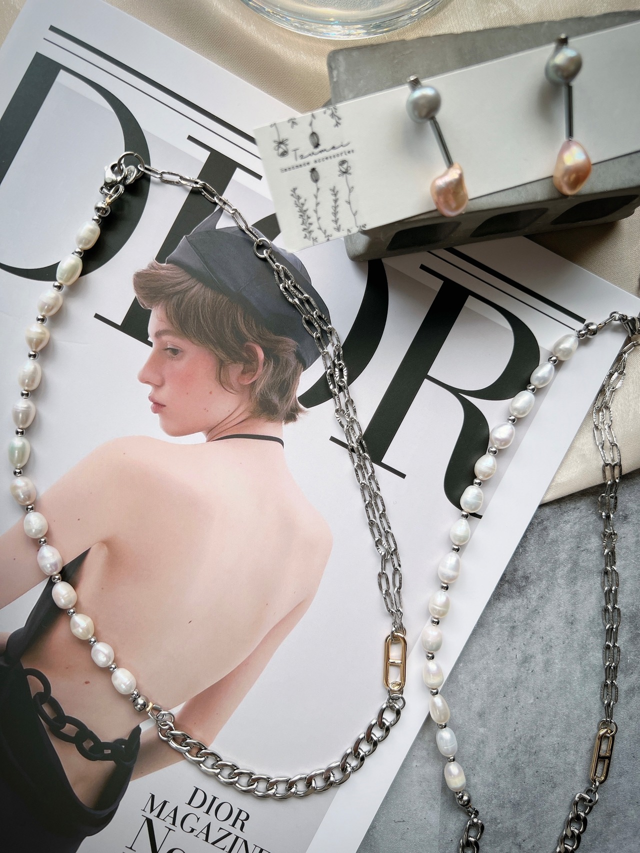 淡水パール×2種類のチェーンをmixしたネックレスです。